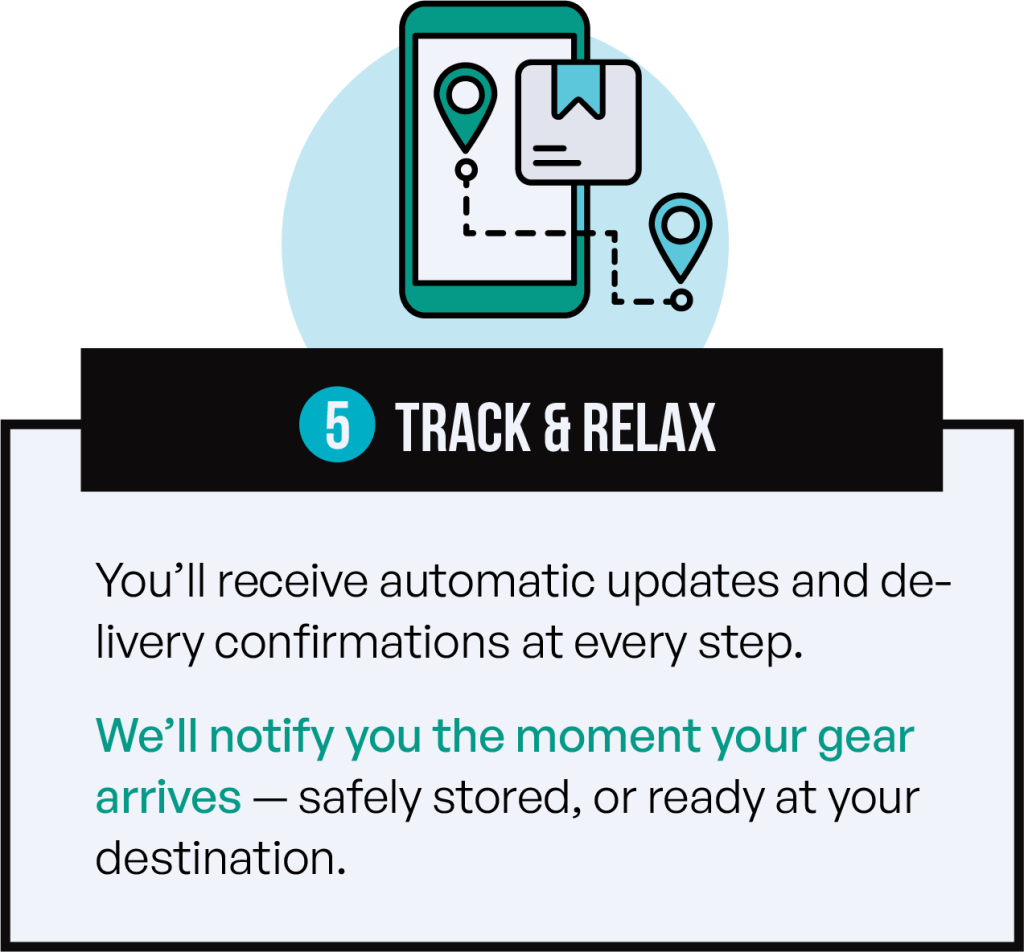 Receive updates when your gear is picked up, arrives at the warehouse, or is delivered to your destination.